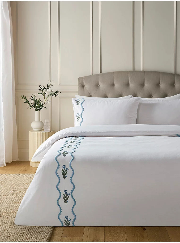 Blue & White Embroidered Floral Wave Cotton Duvet Set