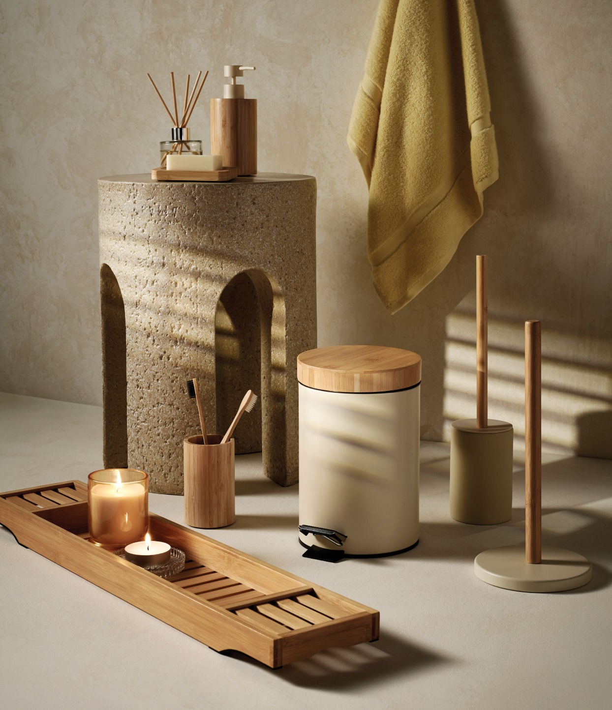 Ugly bathroom bin, be gone! We're really loving this chic bamboo lid design - perfect for styling with other matching bamboo pieces for a cohesive look, from the bath tray to the soap dispenser.