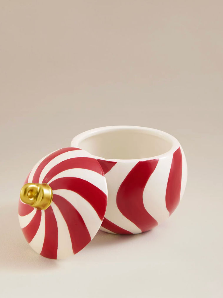 Red & White Christmas Bauble Striped Lidded Pot