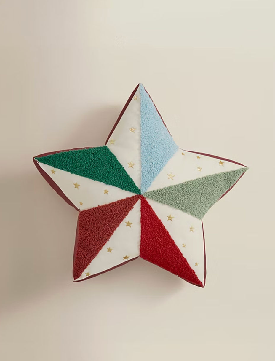 A sweet, nostalgic star cushion that will help turn any room into a cosy, festive retreat. The festive green, red and blue feel joyful, not jarring, and keep the look elevated rather than childish.