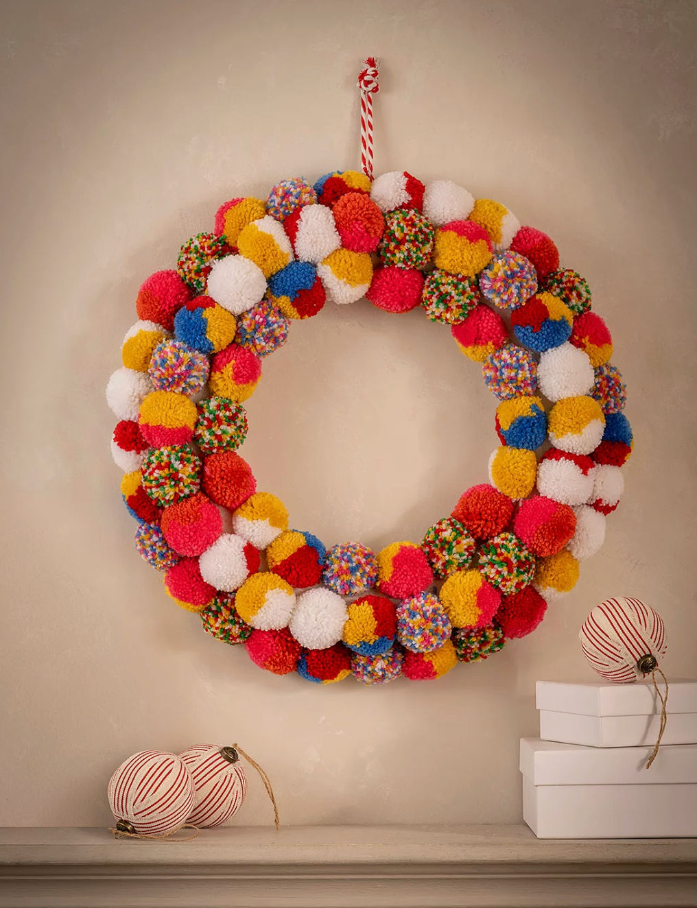 Swap the pine leaves for pom-poms and get an instant smile of approval from your guests when they step inside. This clever wreath puts colourful twist on tradition and introduces a crafty element to any room.
